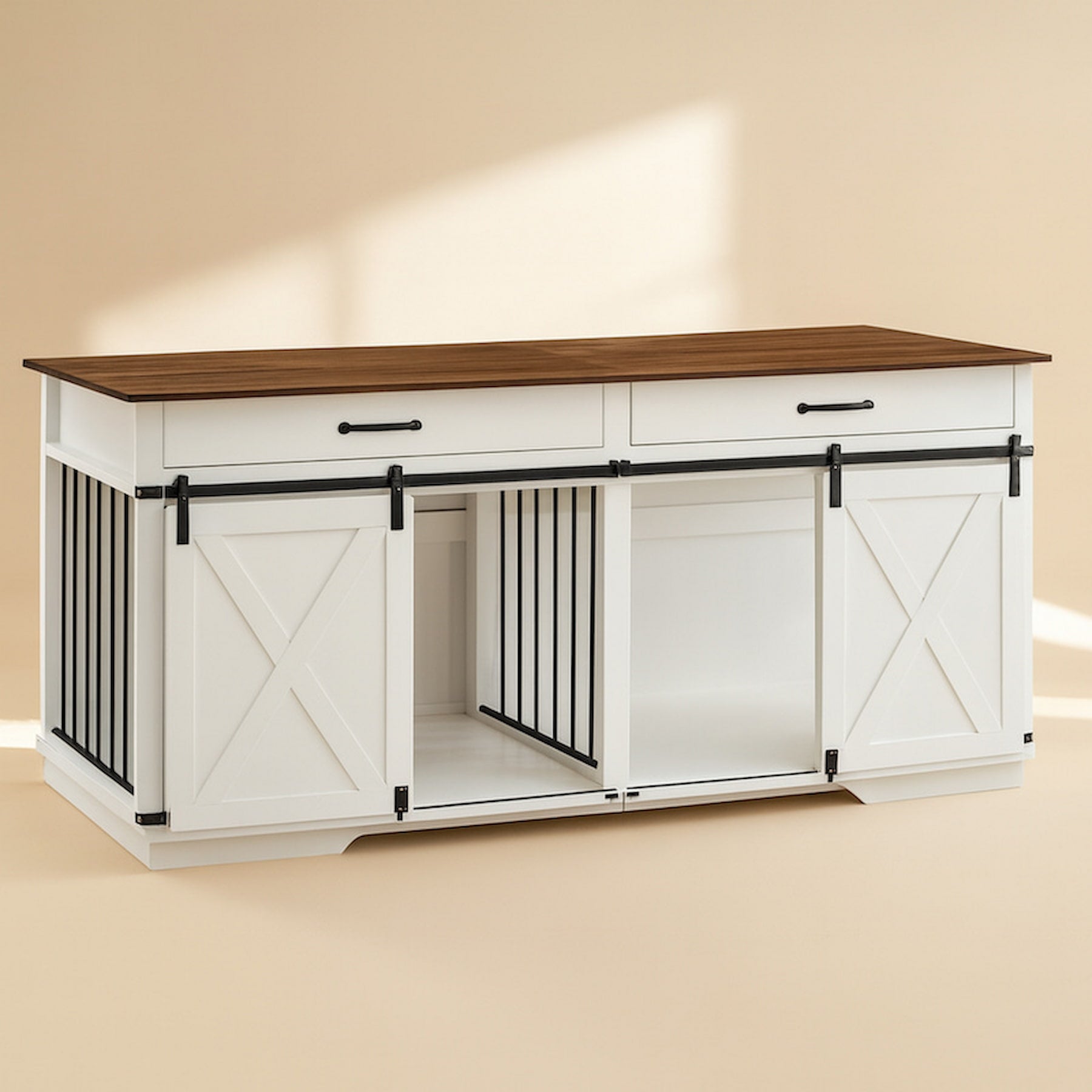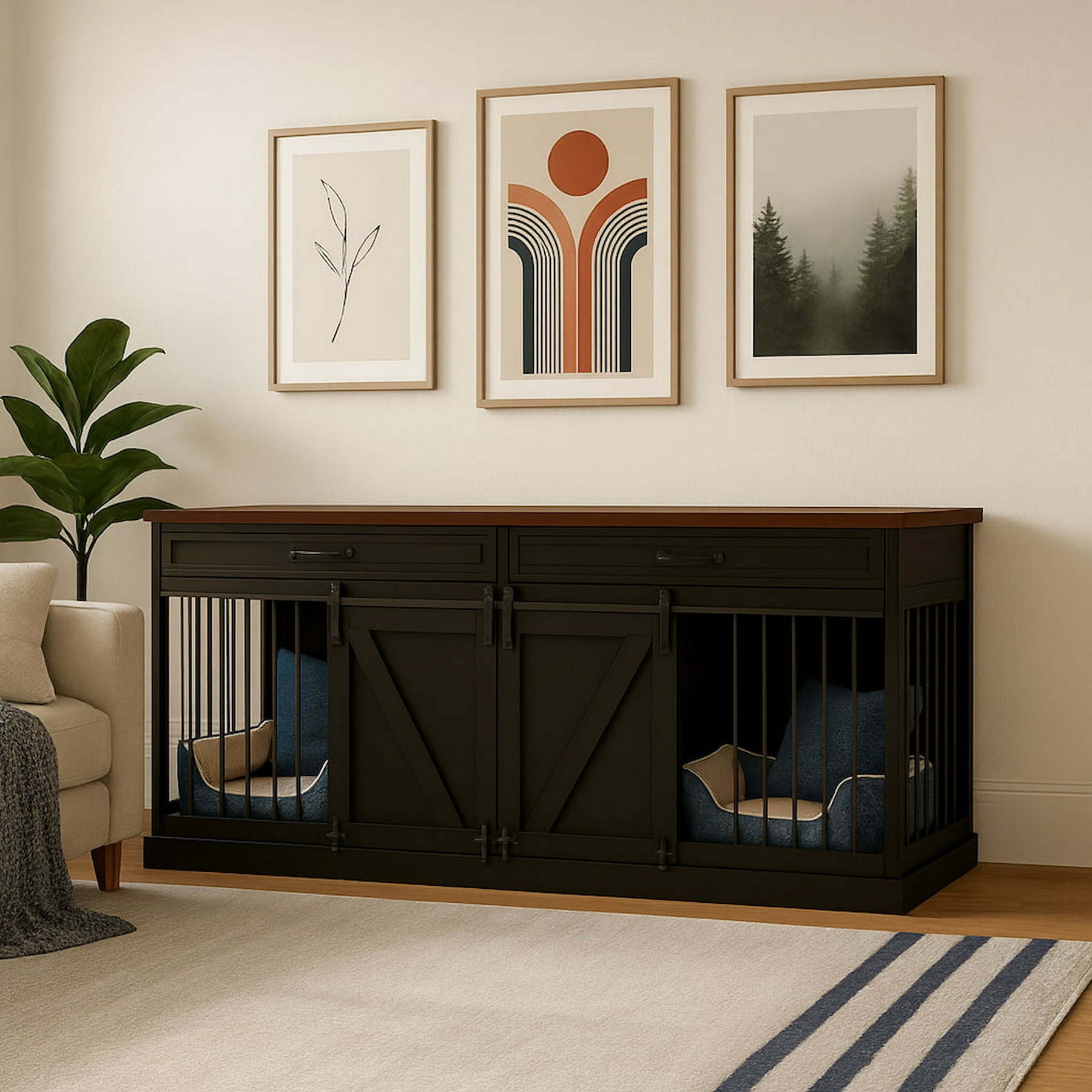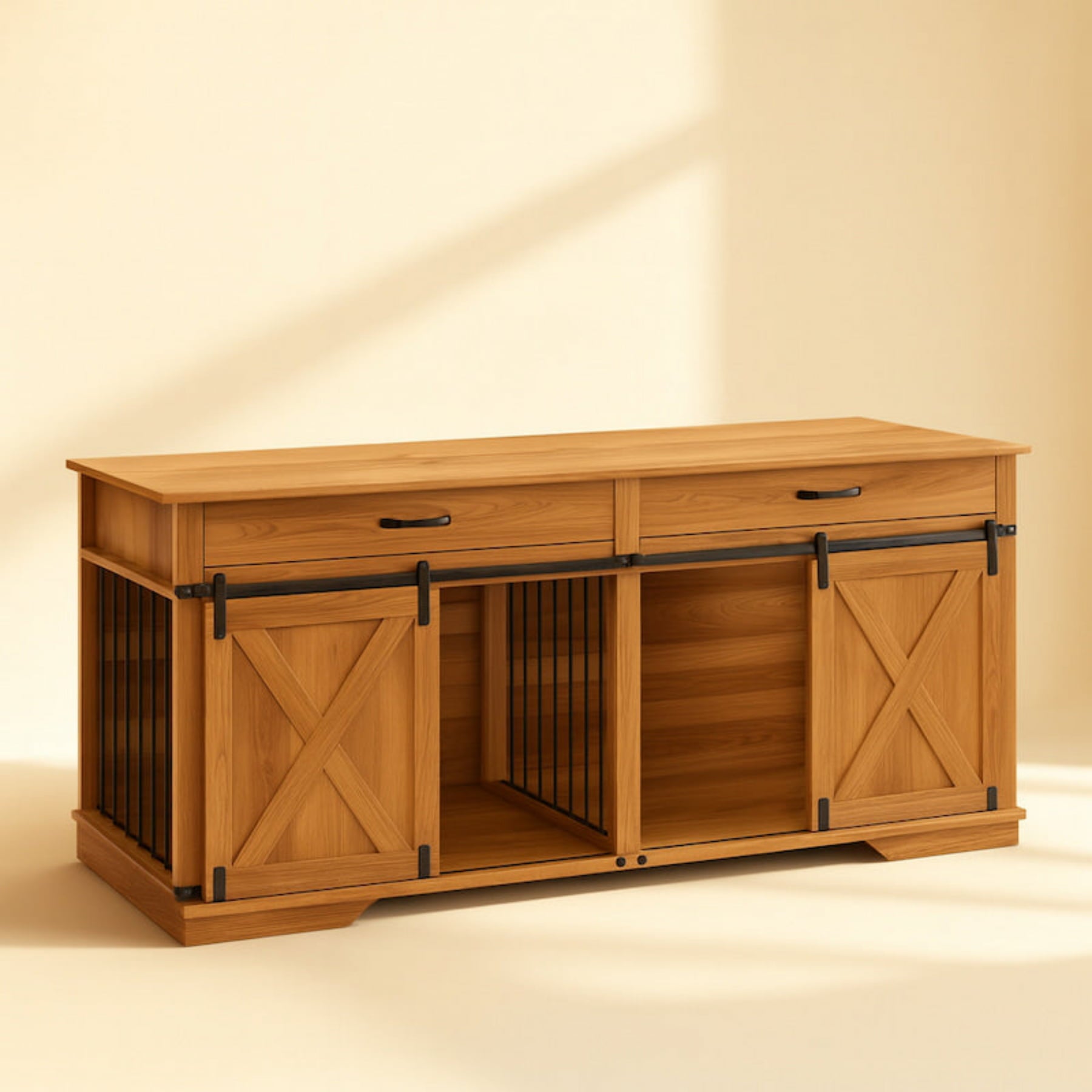 The Ember Crate combines rustic warmth with modern functionality, featuring sliding barn doors, reinforced steel framing, and a rich wood finish that complements farmhouse or transitional interiors. Designed for multi-dog households or larger breeds, its removable center divider allows you to create two separate spaces or one open retreat.
