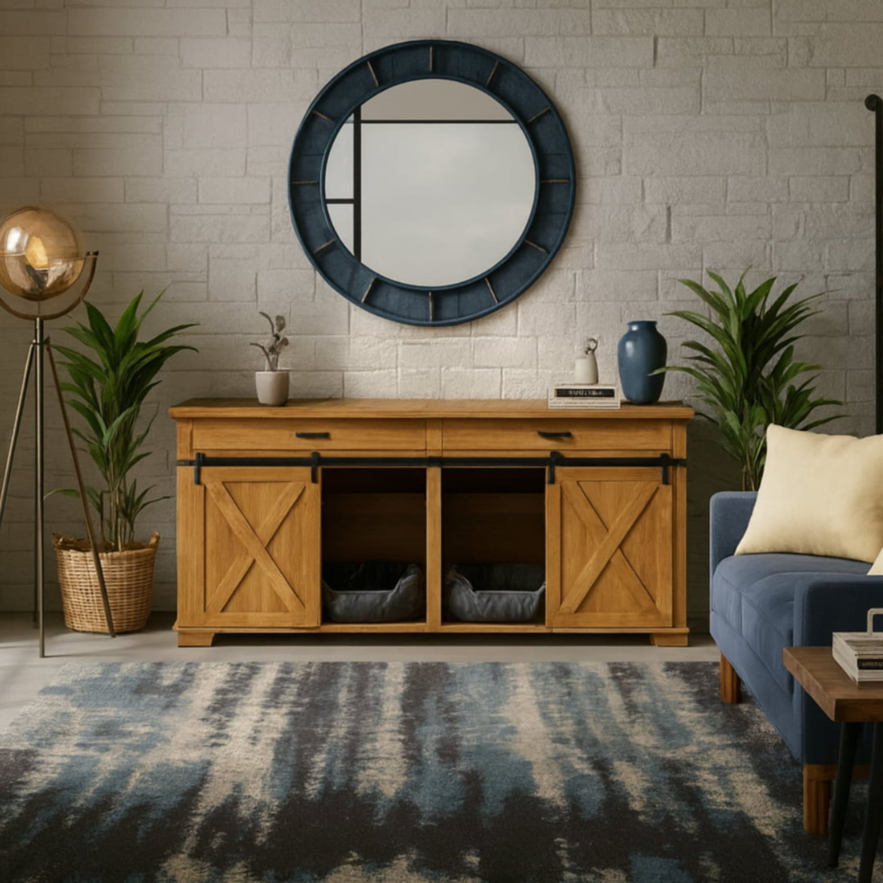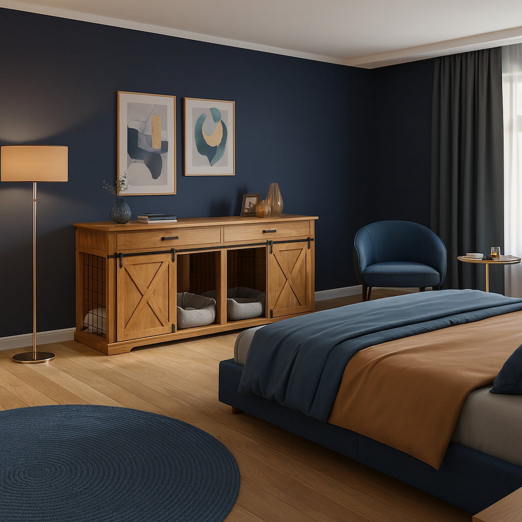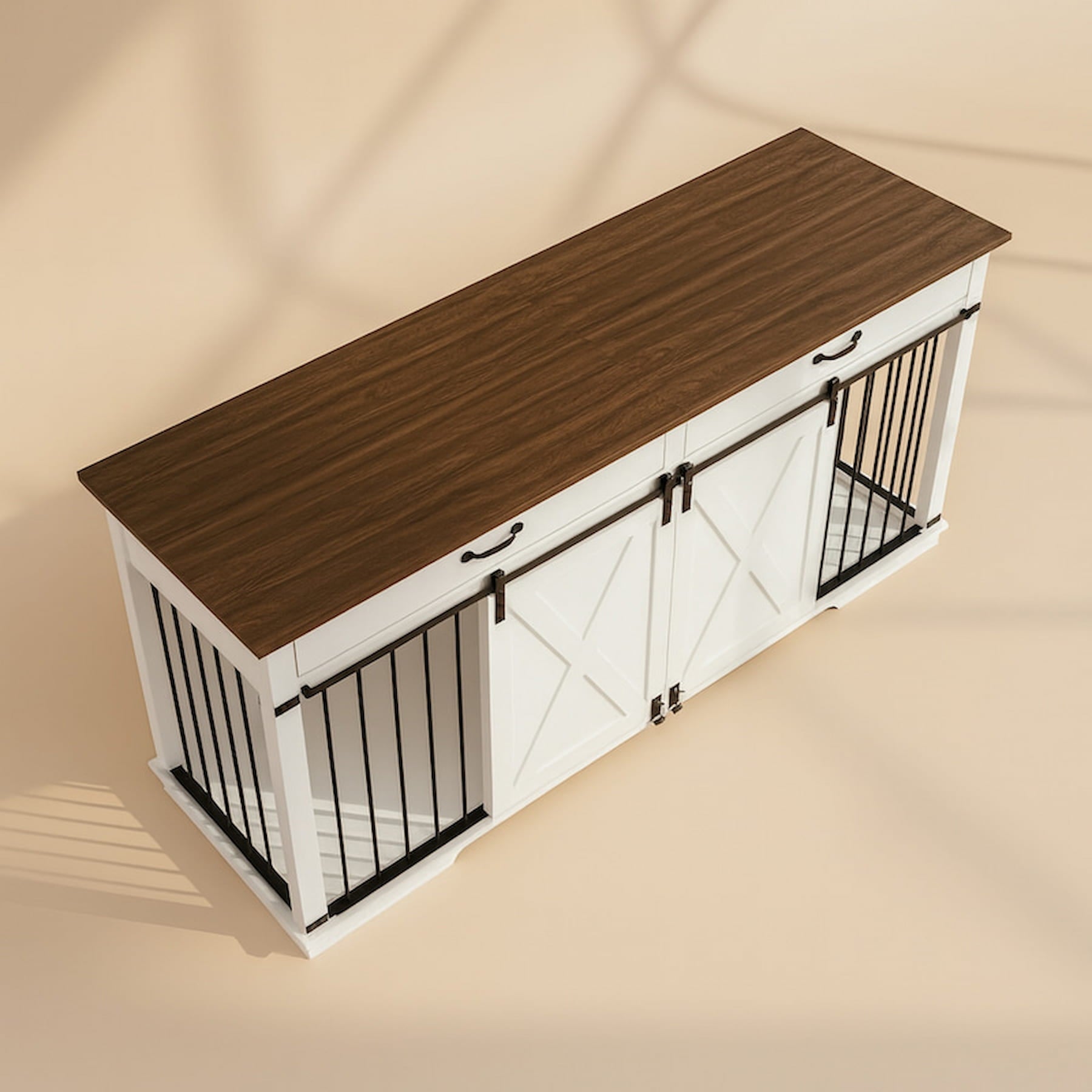 The Ember Crate combines rustic warmth with modern functionality, featuring sliding barn doors, reinforced steel framing, and a rich wood finish that complements farmhouse or transitional interiors. Designed for multi-dog households or larger breeds, its removable center divider allows you to create two separate spaces or one open retreat.