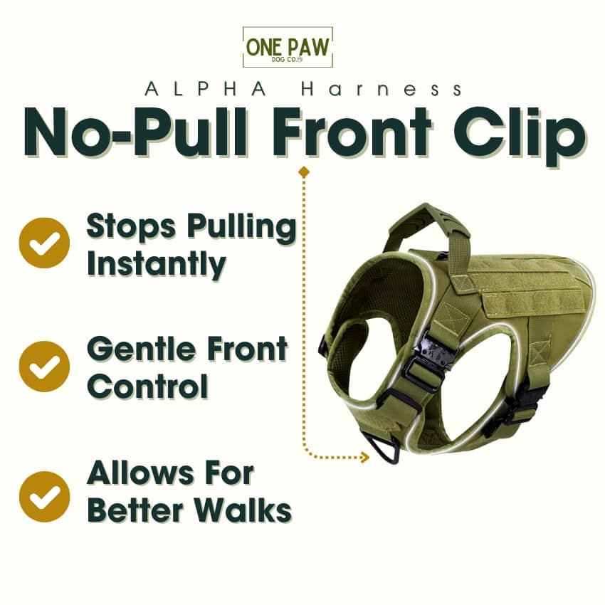 Our Alpha Harness is designed to give you more control with a reinforced no-pull front clip on the chest to stop pulling, as well as a second D-ring attachment on the back for regular walks.