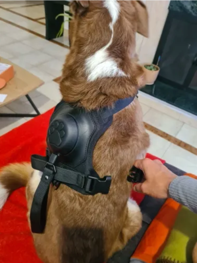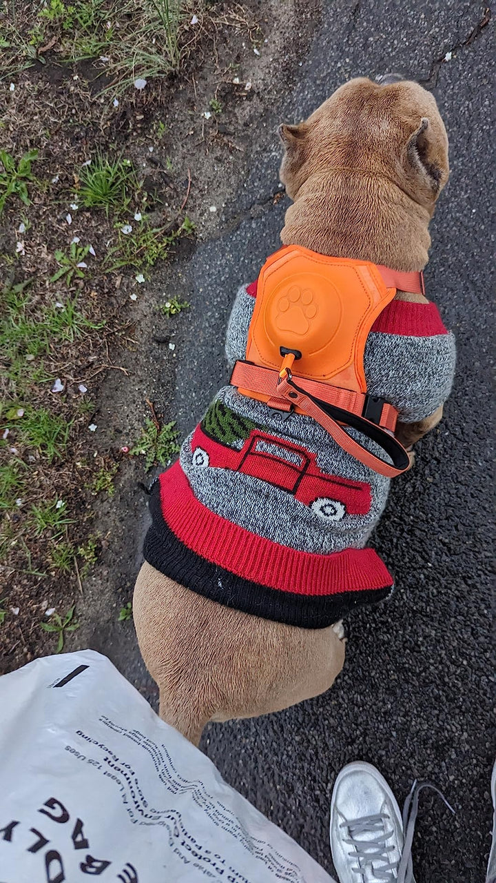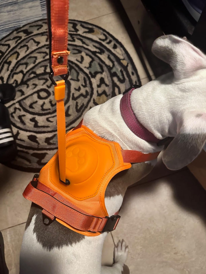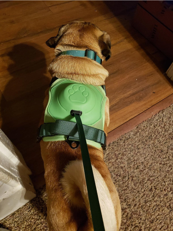 Our Rover Harness weighs between 4.6 and 8 ounces depending on size, which is roughly the weight of two to four eggs. It should be comfortable for any dog wearing it.