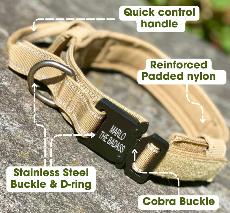 Designed with a padded no-pull control handle, military-grade nylon, and Cobra buckles, our collar is perfect for every occasion & adventure!