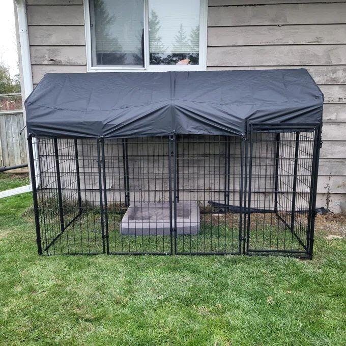 The kennel is constructed from galvanized steel panels designed to withstand prolonged exposure to outdoor conditions. Welded steel bars and wire create a rigid enclosure that resists corrosion while maintaining consistent airflow throughout the space. The structure is intended for stable, long-term placement in residential or professional outdoor environments.