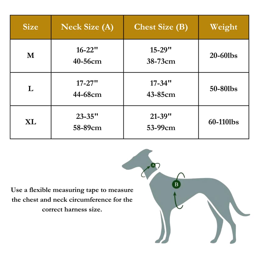 First, you need to measure your dog and get the key measurements (Neck and Chest). Then you can compare it with the size chart we provided above in the product description