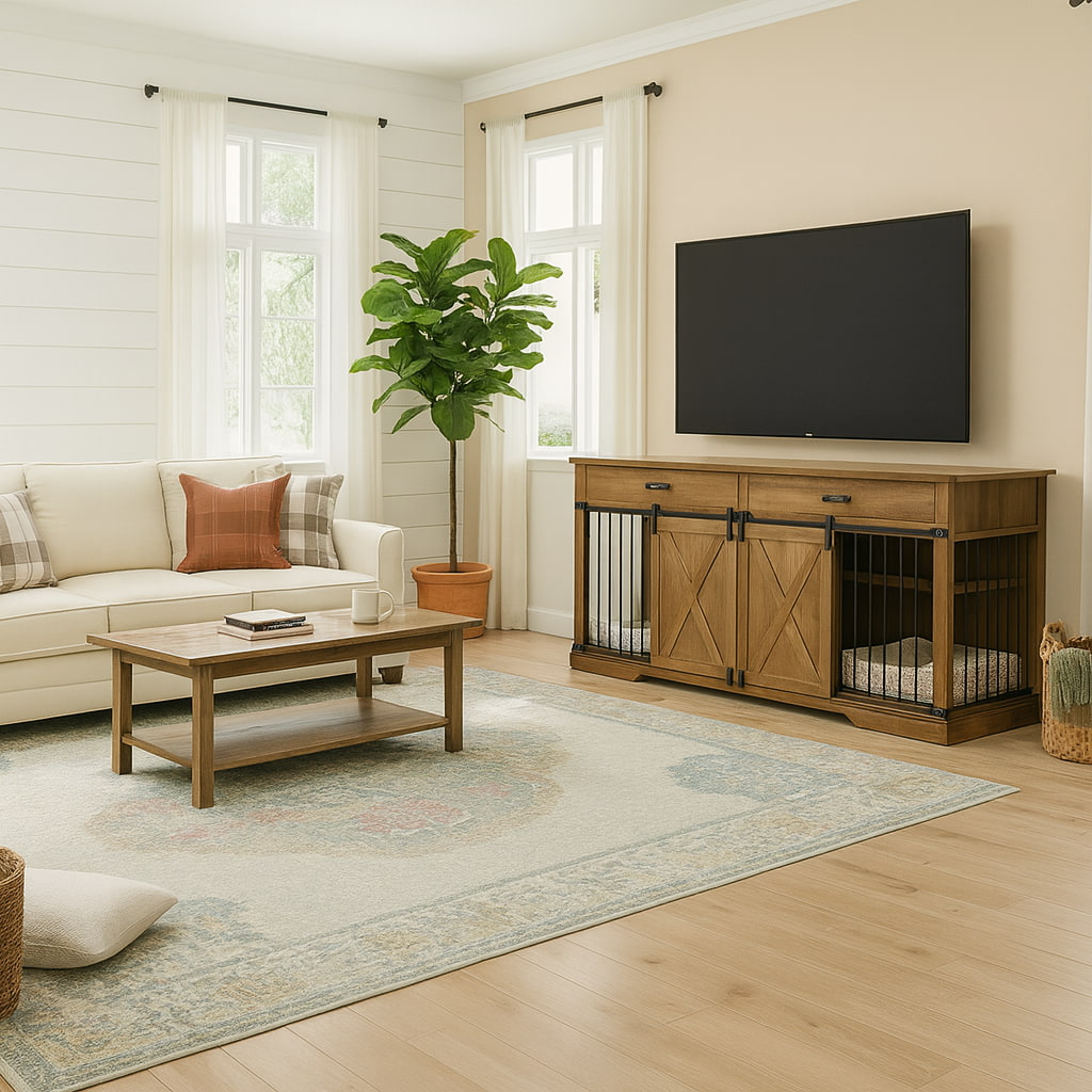The Ember Crate combines rustic warmth with modern functionality, featuring sliding barn doors, reinforced steel framing, and a rich wood finish that complements farmhouse or transitional interiors. Designed for multi-dog households or larger breeds, its removable center divider allows you to create two separate spaces or one open retreat.