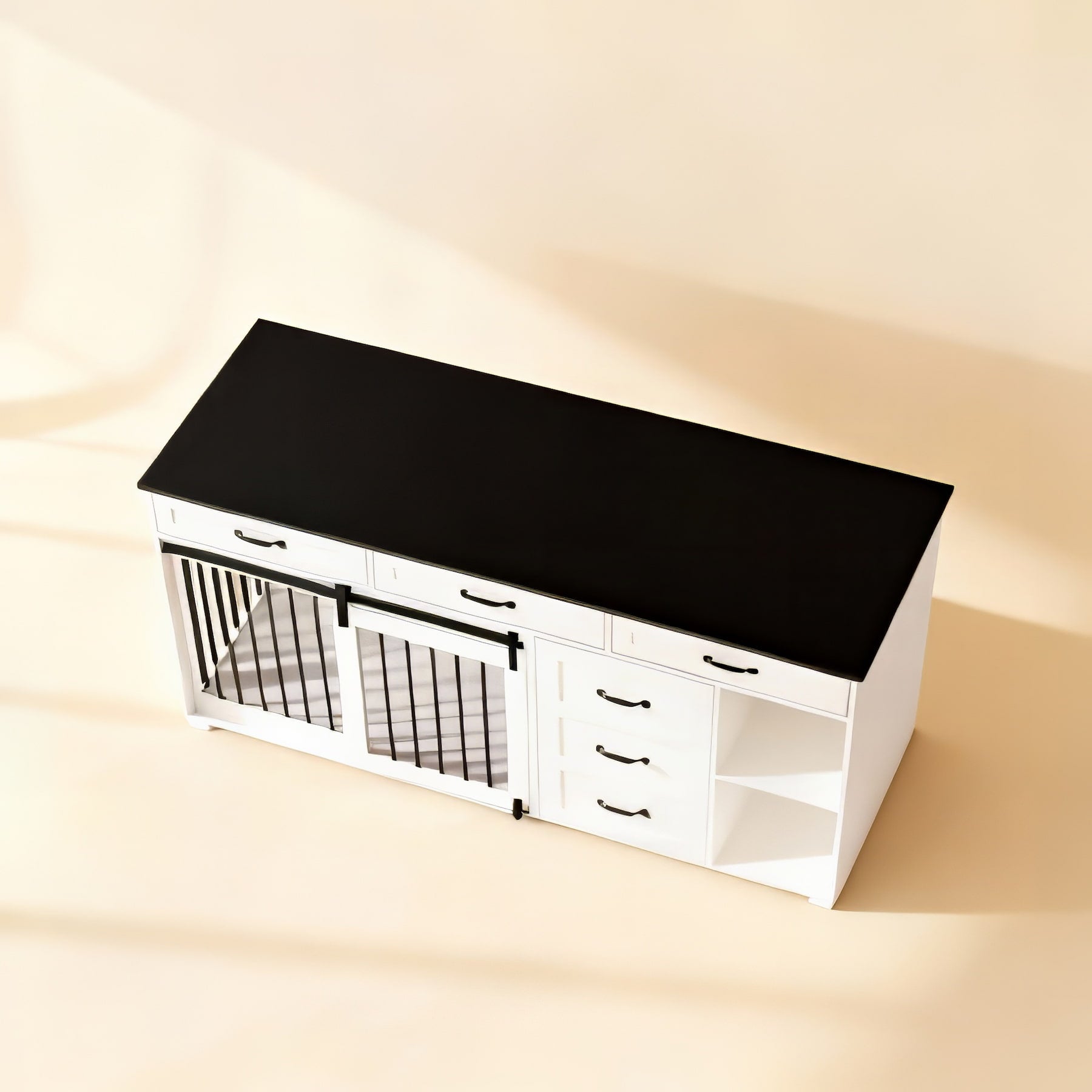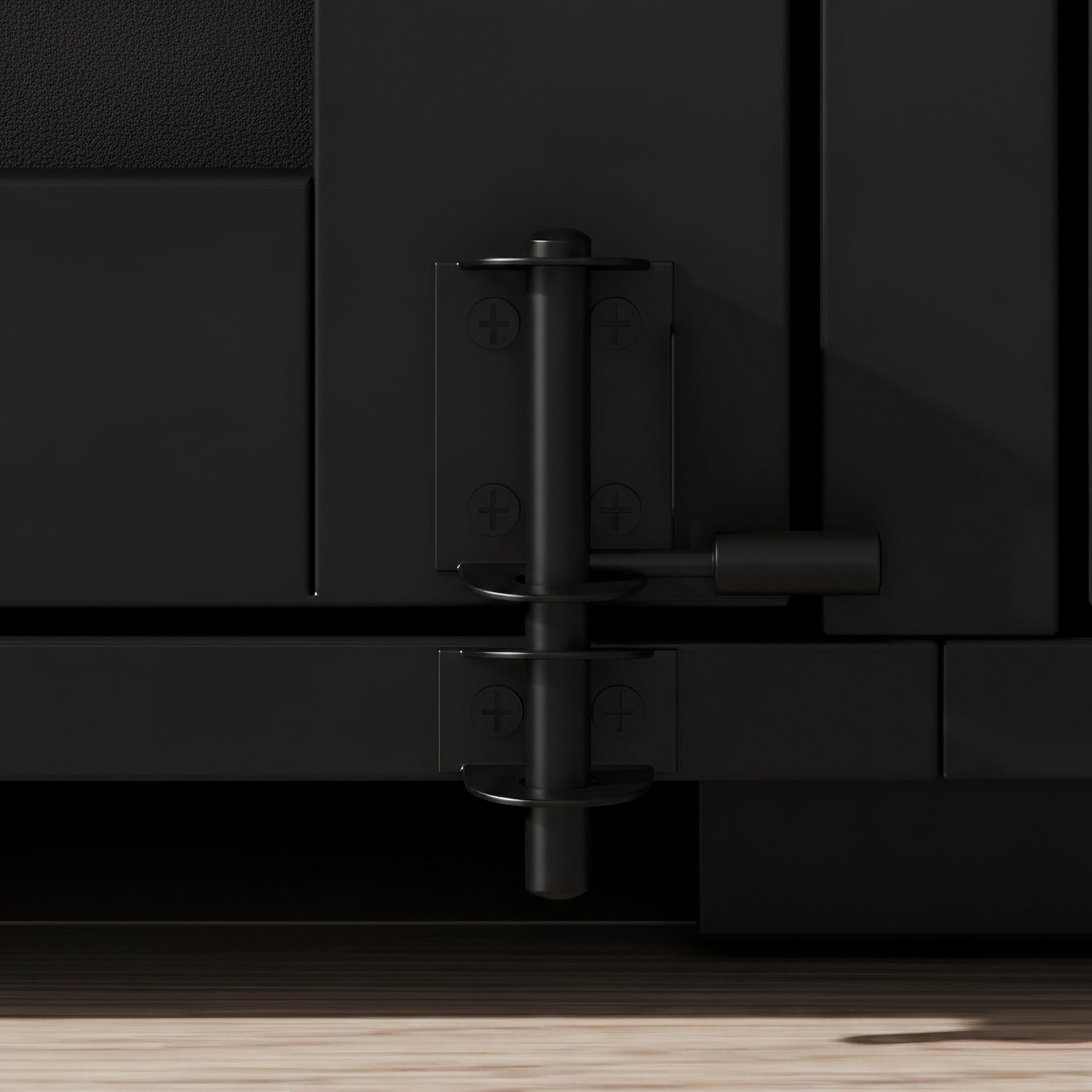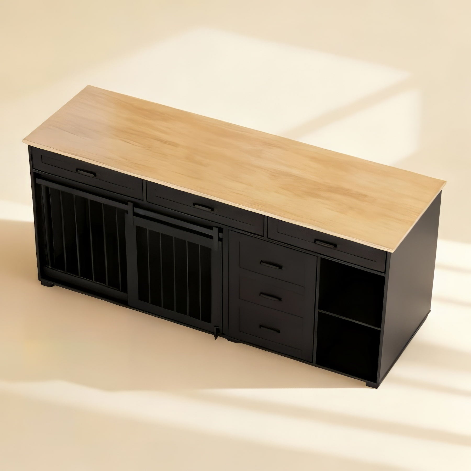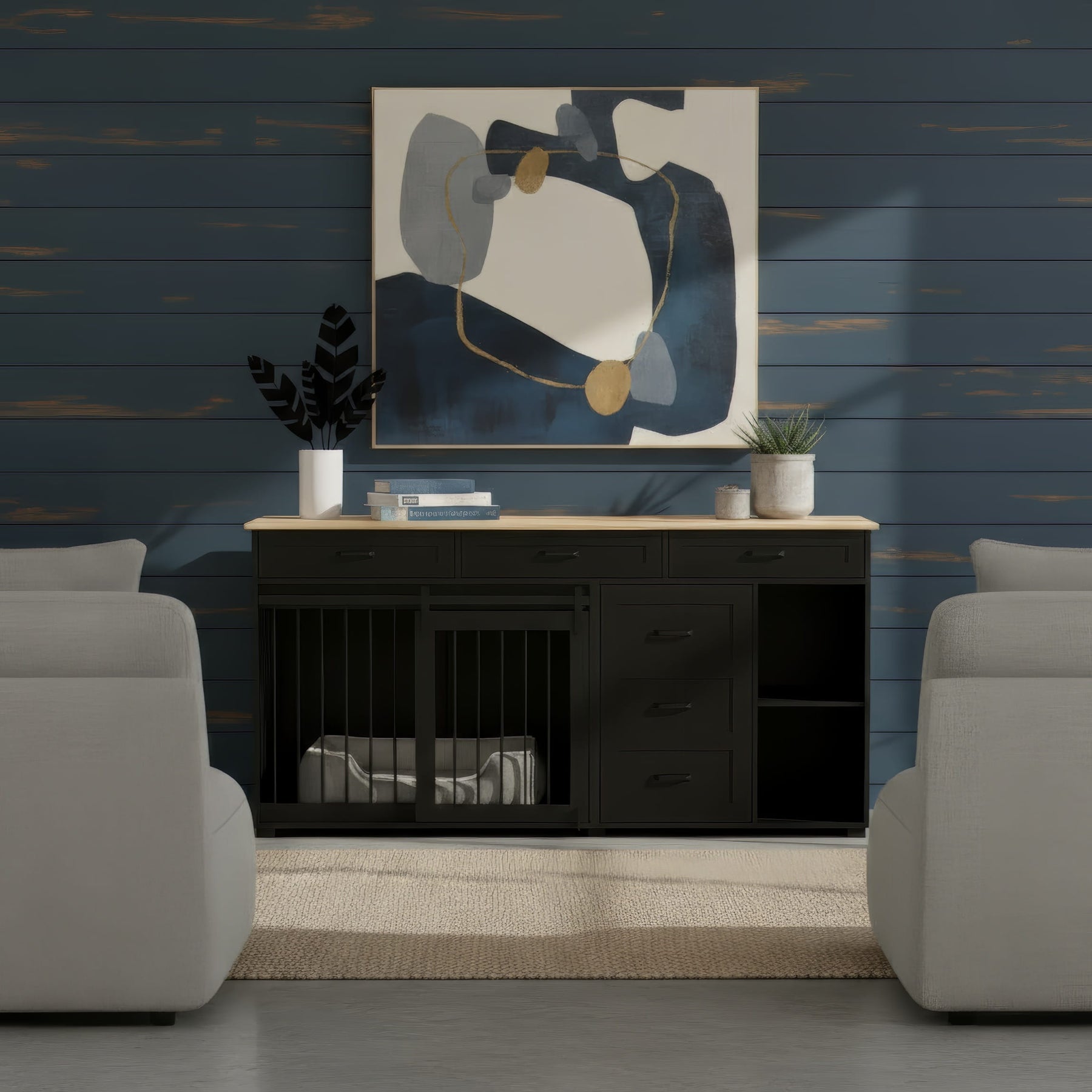 Three flush drawers and a tall cabinet are built directly into the crate’s frame for seamless, unobtrusive organization. The layout supports daily function while preserving visual simplicity. Designed to maintain balance and clarity, it complements the surrounding space with ease.