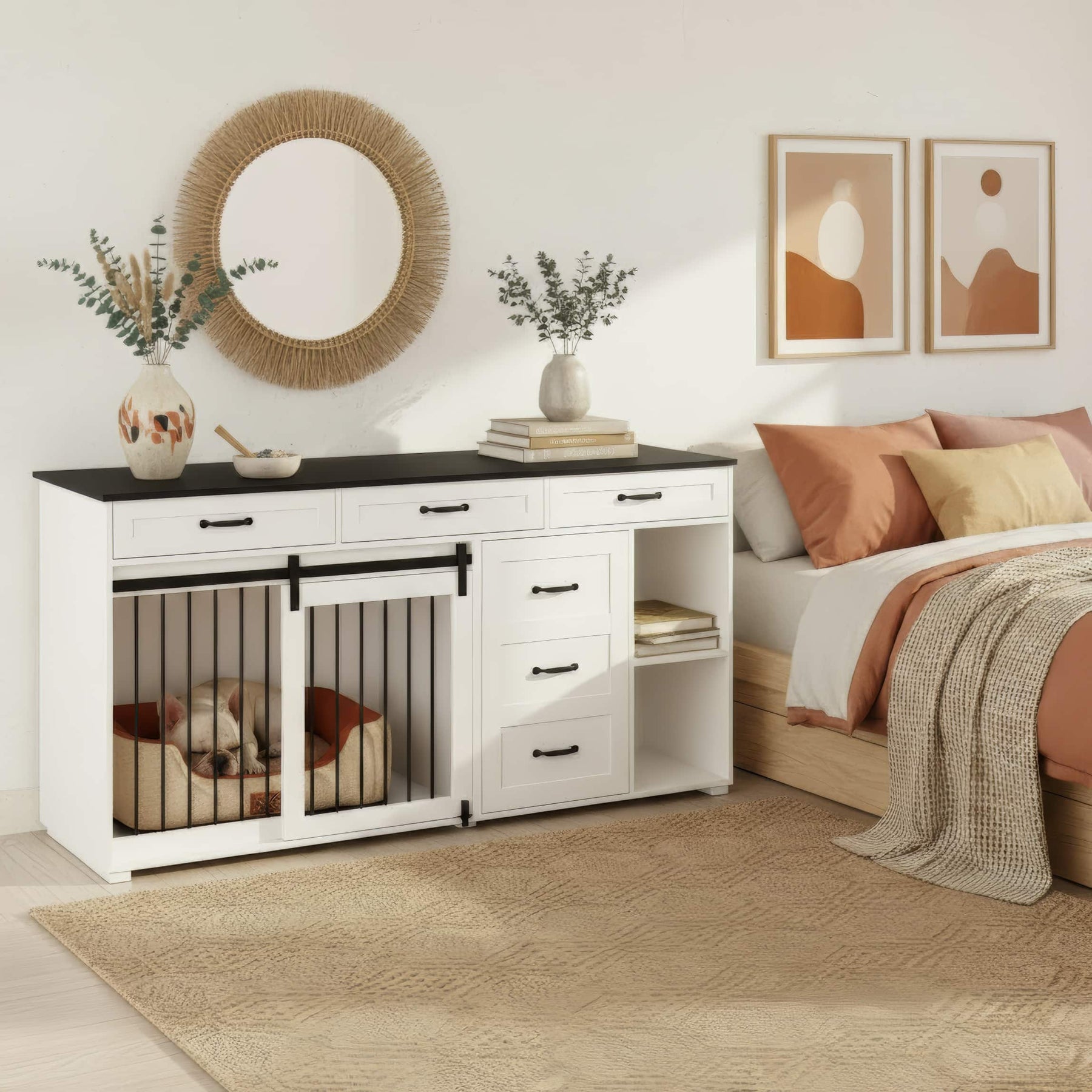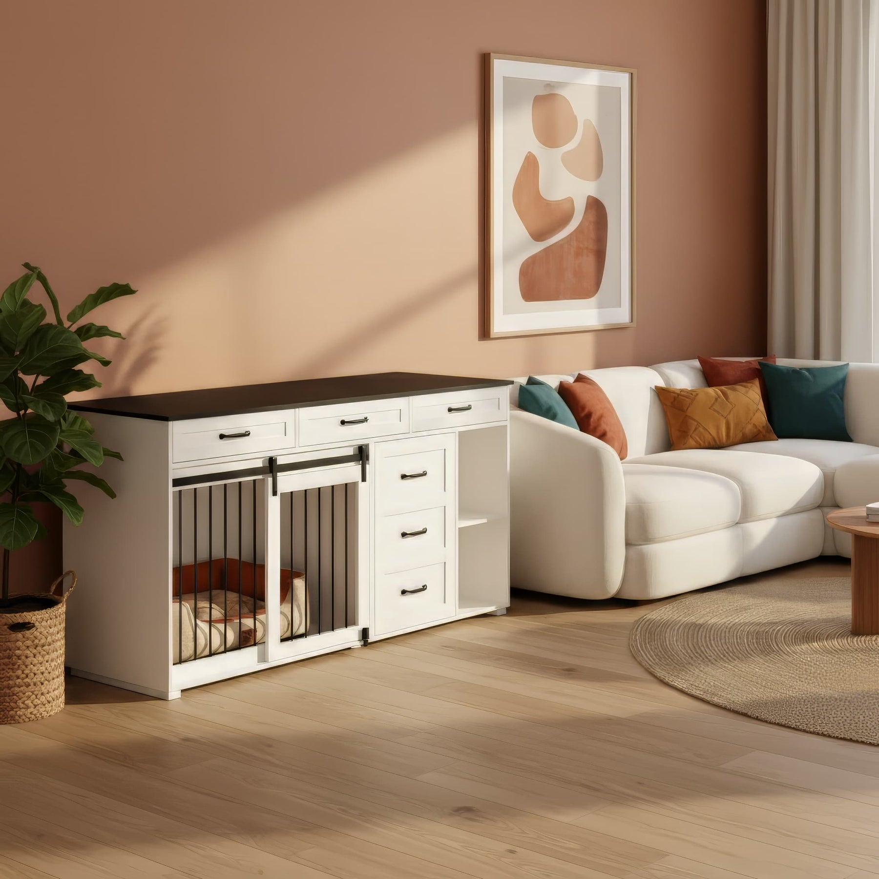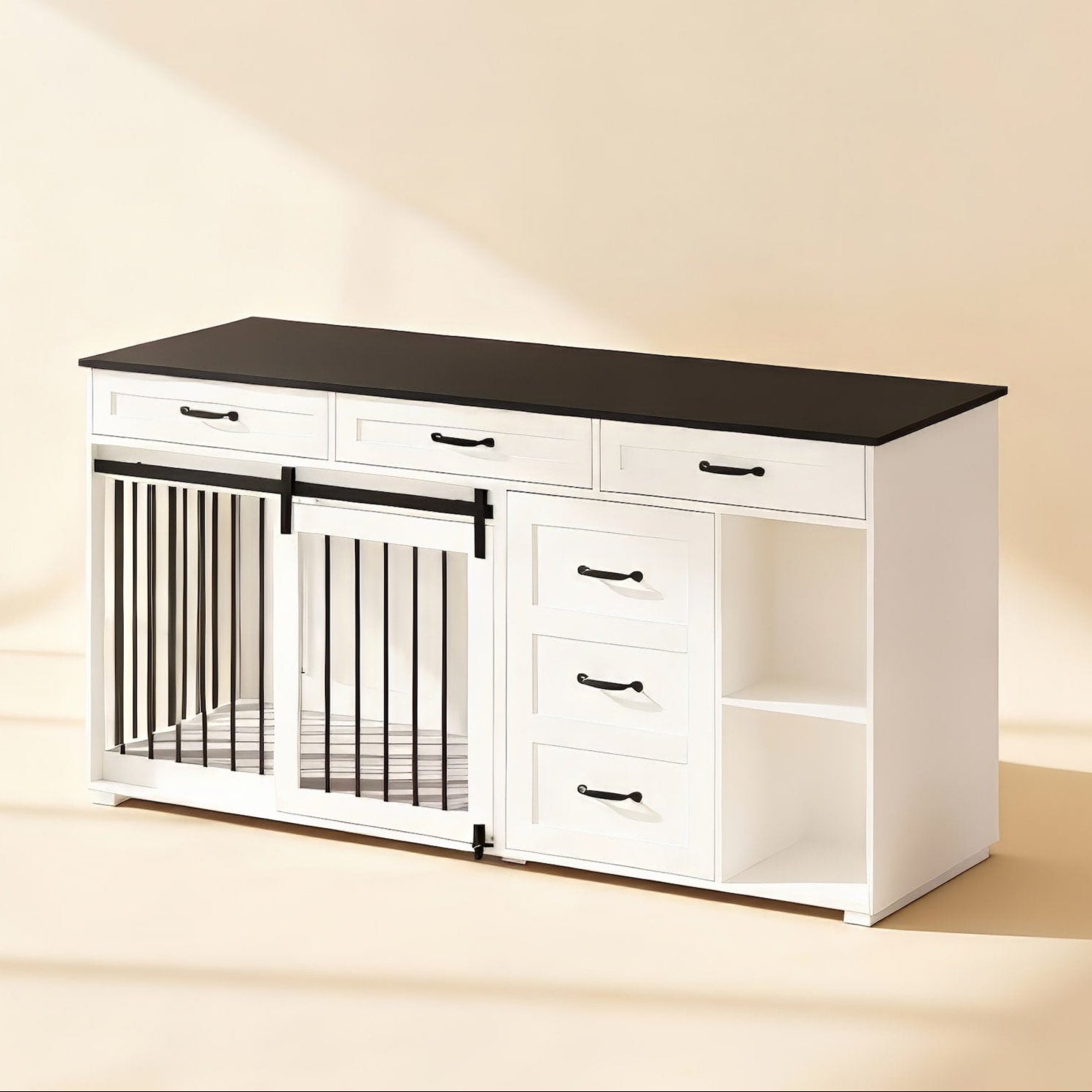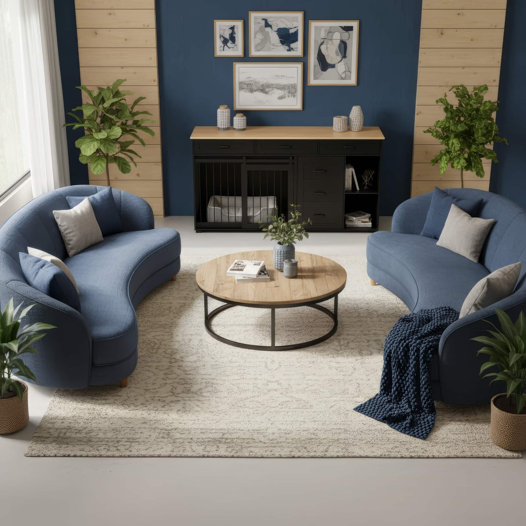 Three flush drawers and a tall cabinet are built directly into the crate’s frame for seamless, unobtrusive organization. The layout supports daily function while preserving visual simplicity. Designed to maintain balance and clarity, it complements the surrounding space with ease.