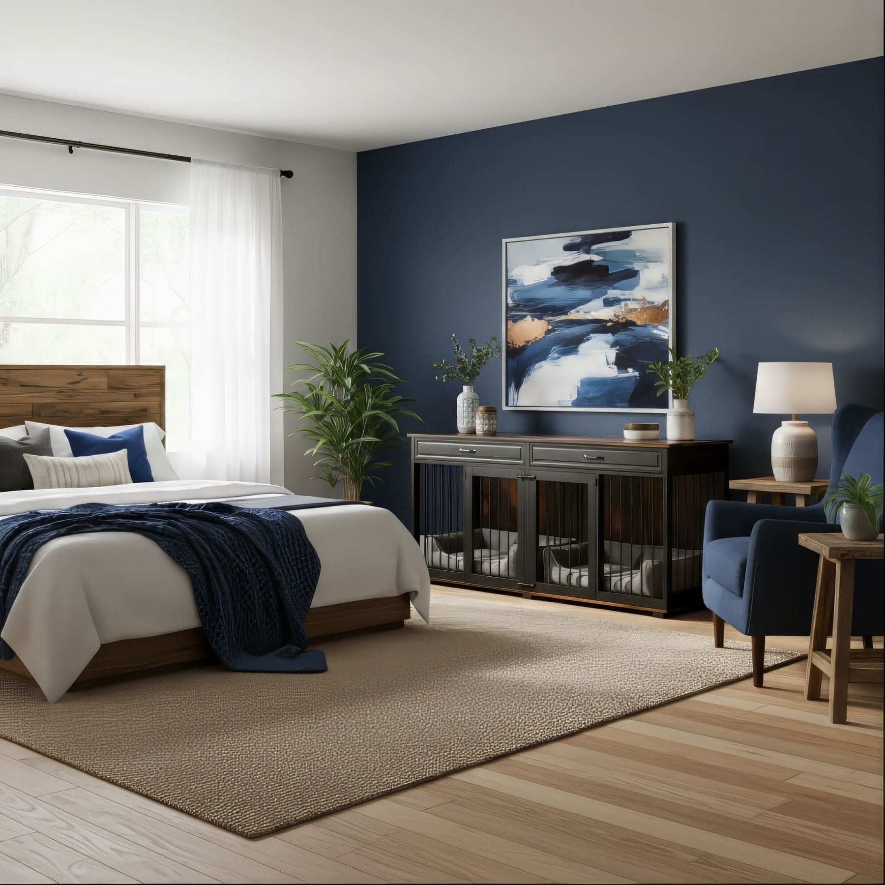 e Vesta Crate features dual drawers, a wide top surface, and an optional divider for two-dog households. With its clean lines and furniture-grade build, it fits seamlessly into modern, farmhouse, or transitional interiors while providing your dog with a secure place to