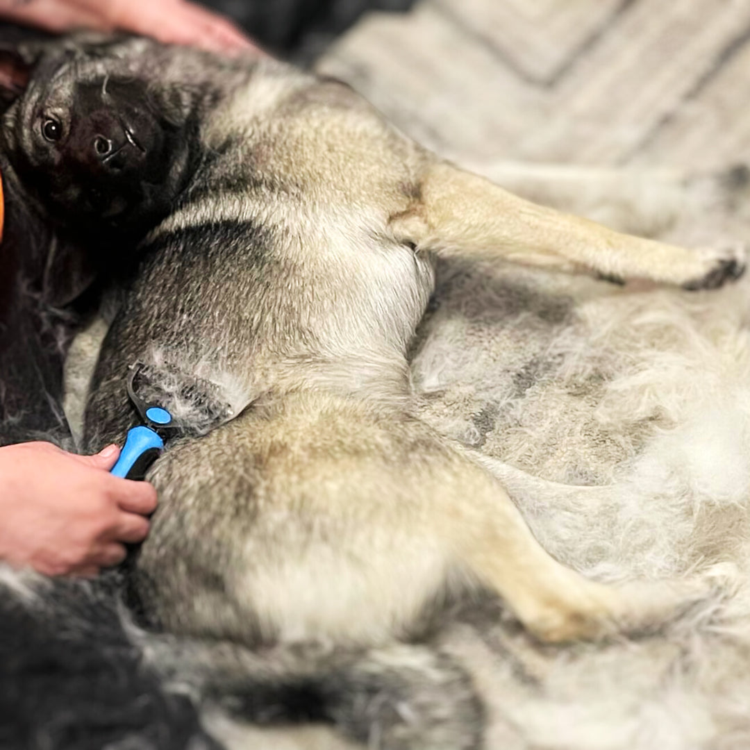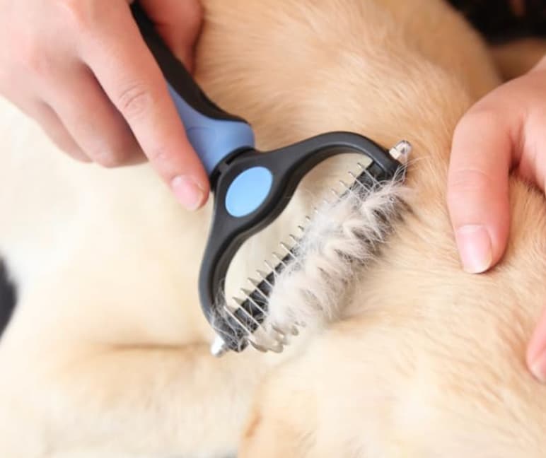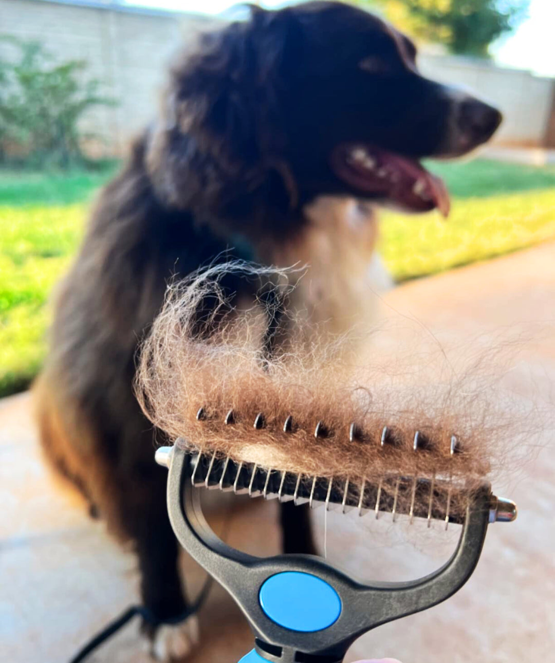 Our deshedding brush is a powerful solution for pet grooming needs. It gently eliminates loose hair, tangles, knots, dander, and trapped dirt, making it ideal for pets with thick fur or dense double coats.